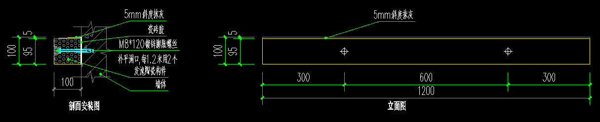 (1)安裝方法:構(gòu)件與墻體之間采用錨粘法固定,預(yù)先在構(gòu)件背面均勻抹上瓷磚膠(或?qū)S谜迟N劑),調(diào)整位置粘貼在墻上后再打M8膨脹螺絲固定,用膠泥封堵螺絲洞口表面;兩端處錨栓位置與邊框距離不少于50mm,錨栓打孔間距600mm可作適當(dāng)調(diào)整。如圖:
